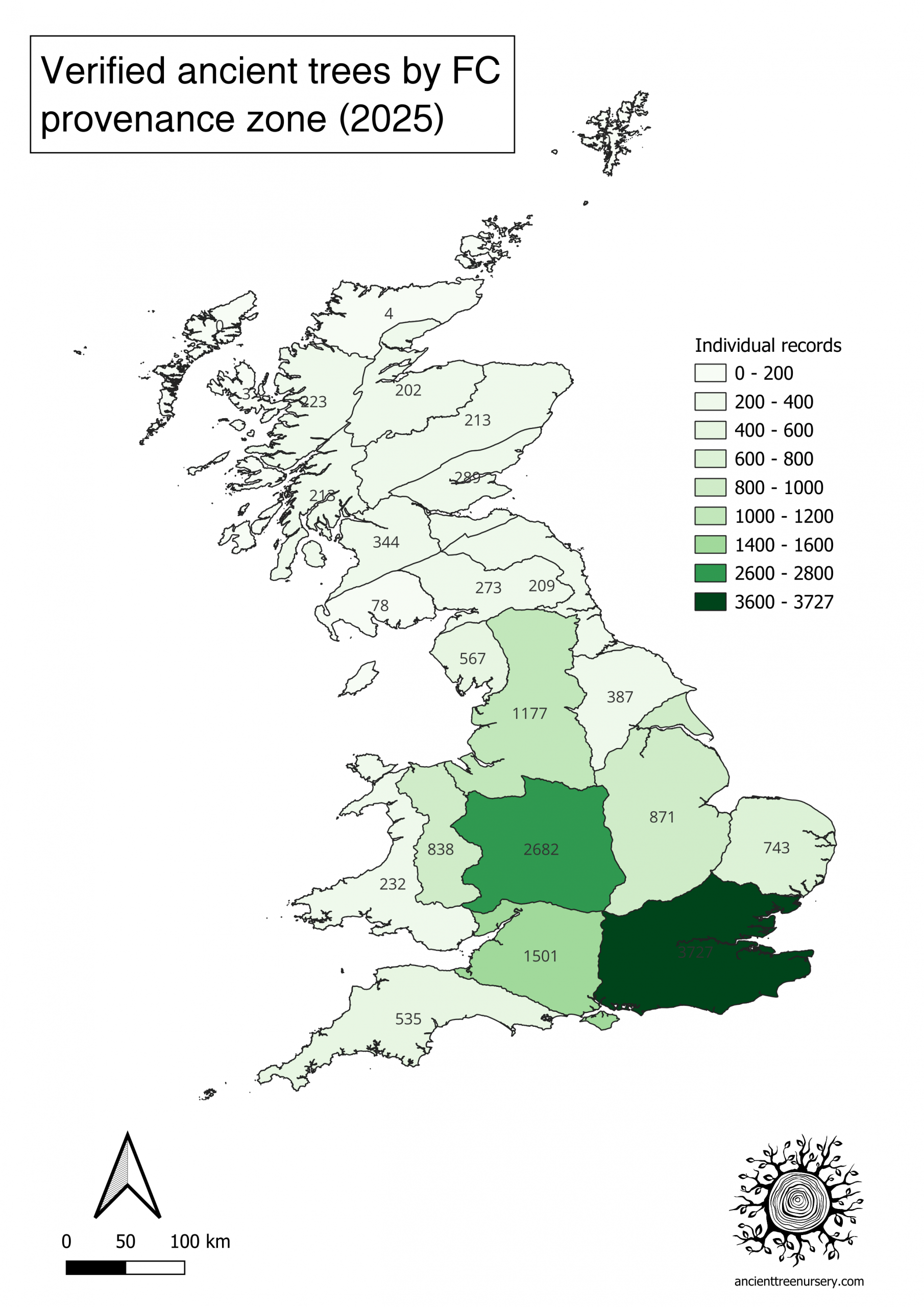 It will also help understand the balance between demand for tree saplings and the capacity of known ancient trees to supply FRM. Even at a very coarse resolution it’s obvious that the distribution of trees in the ATI doesn’t reflect the distribution of tree planting activity across the UK.
