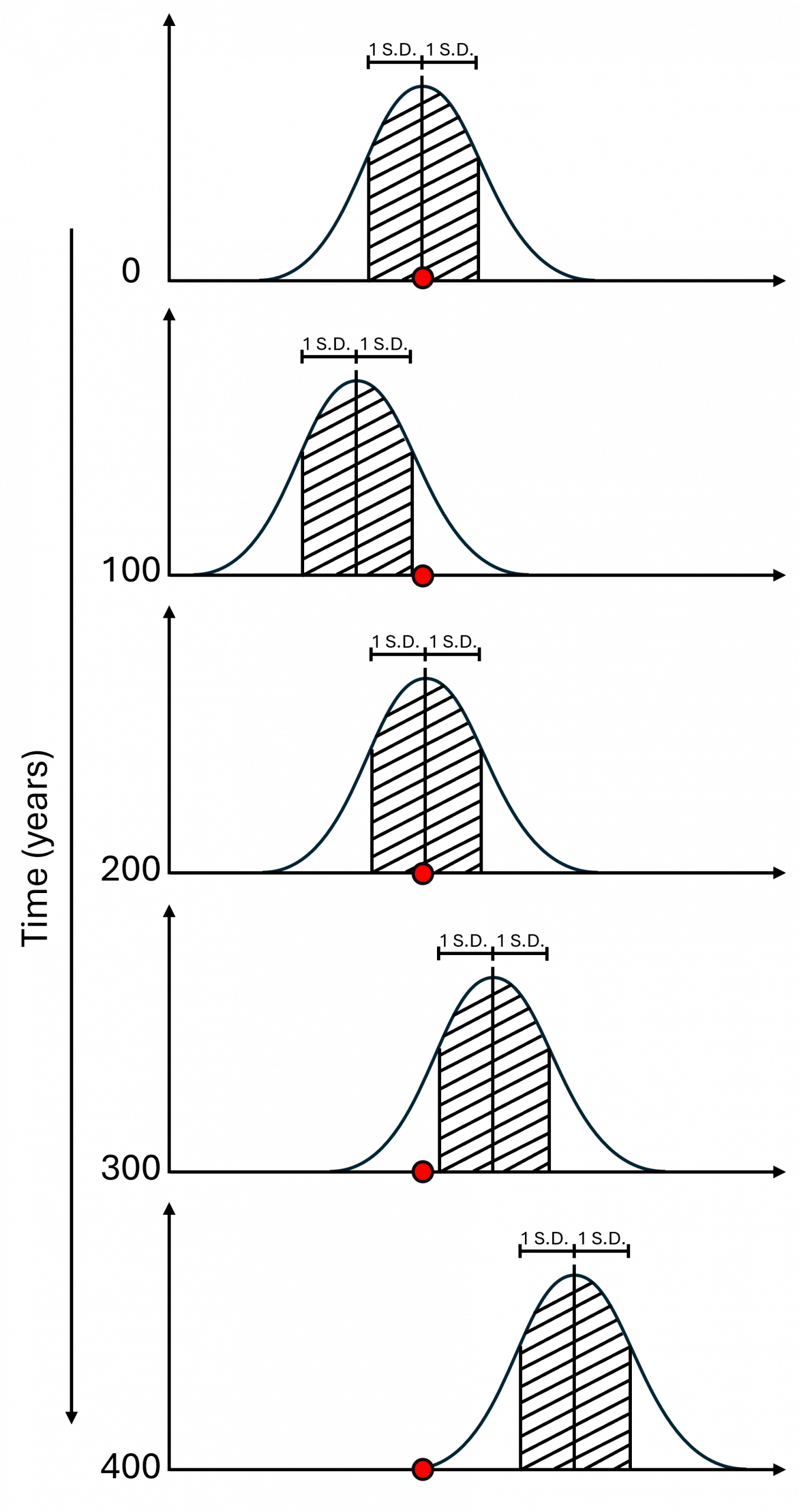 The effect is illustrated below. Any given trait will have a range of values, which in this example are normally distributed about a mean. An individual tree at time T=0 is denoted by the red dot. In this case its trait value is close to the population mean.